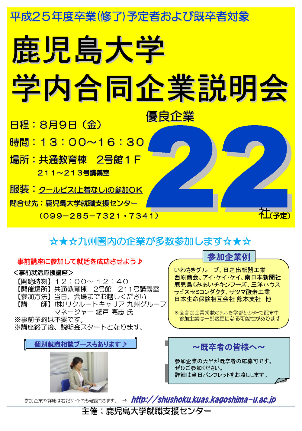 【お問い合わせ先】 鹿児島大学就職支援センター (099-285-7321・7341)