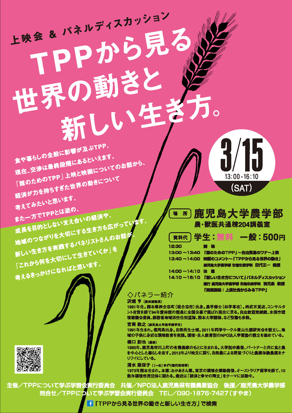 TPPについて学ぶ学習会実行委員会主催(鹿児島大学農学部後援)で上映会&パネルディスカッション 「TPPから見る世界の動きと新しい生き方。」を開催します。