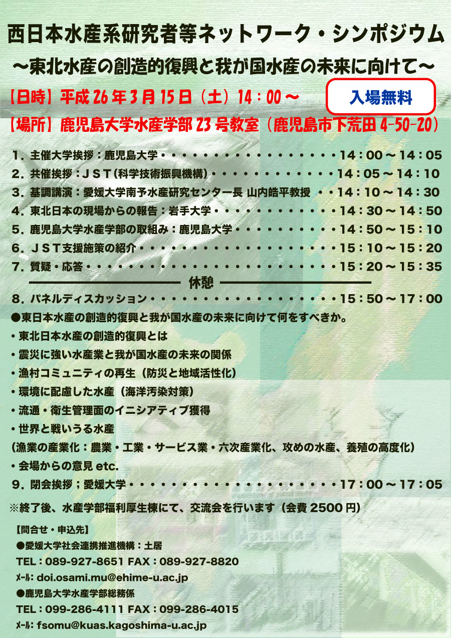 鹿児島大学水産学部ではシンポジウム「東北水産の創造的復興と我が国水産の未来に向けて」を開催します。