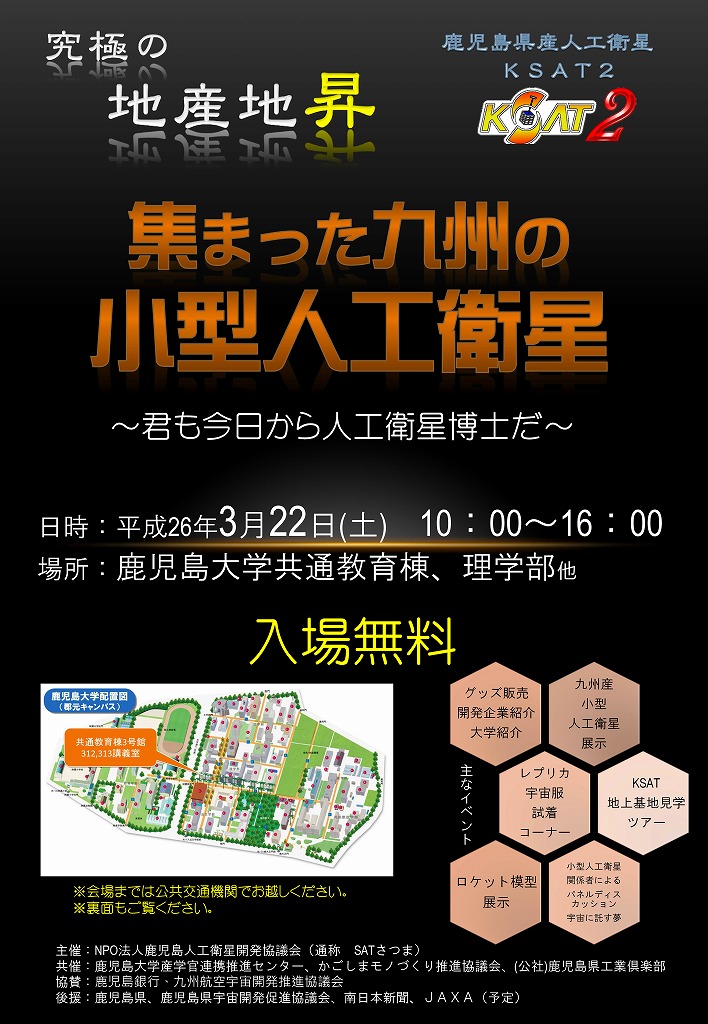 KSAT開発に従事した企業や大学関係者等の集まりであるNPO法人鹿児島衛星協議会では、九州の大学等で開発された小型人工衛星を集めて、宇宙を体感できるイベントを開催します。