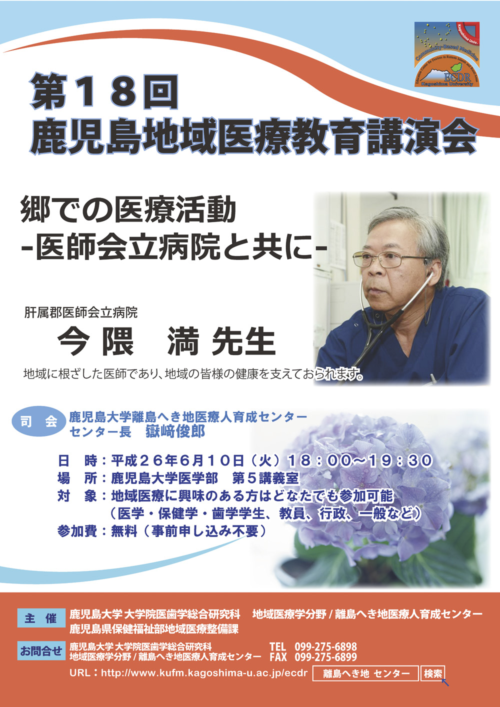 今回の講演者の今隈満先生は、肝属郡医師会立病院、今隈医院の医師で、神経内科・一般内科を専門領域として地域に根ざした医療活動を長年にわたりされており、地域の皆様の健康を支えておられます。 地域医療に関心のある、医療関係者、医学生、看護学生、歯学生、歯科関係者、行政、一般市民の方々などに、広く聴講していただき、地域医療の現状を知る良い機会としてもらいたいと思います。