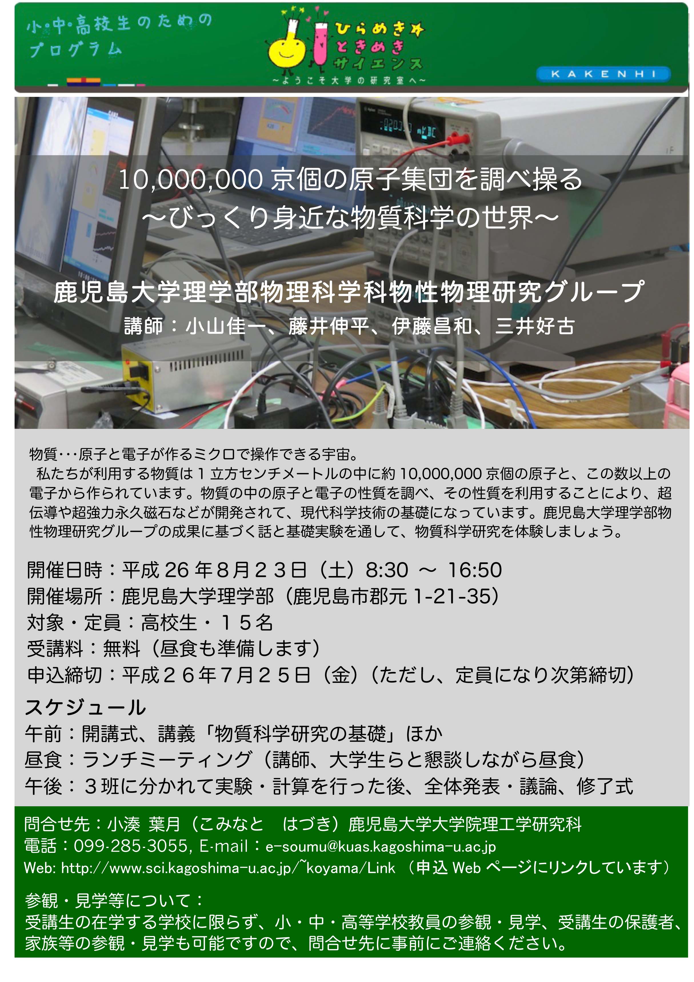 鹿児島大学理学部物性物理研究グループの成果に基づく話と基礎実験を通して、物質科学研究を体験しましょう。