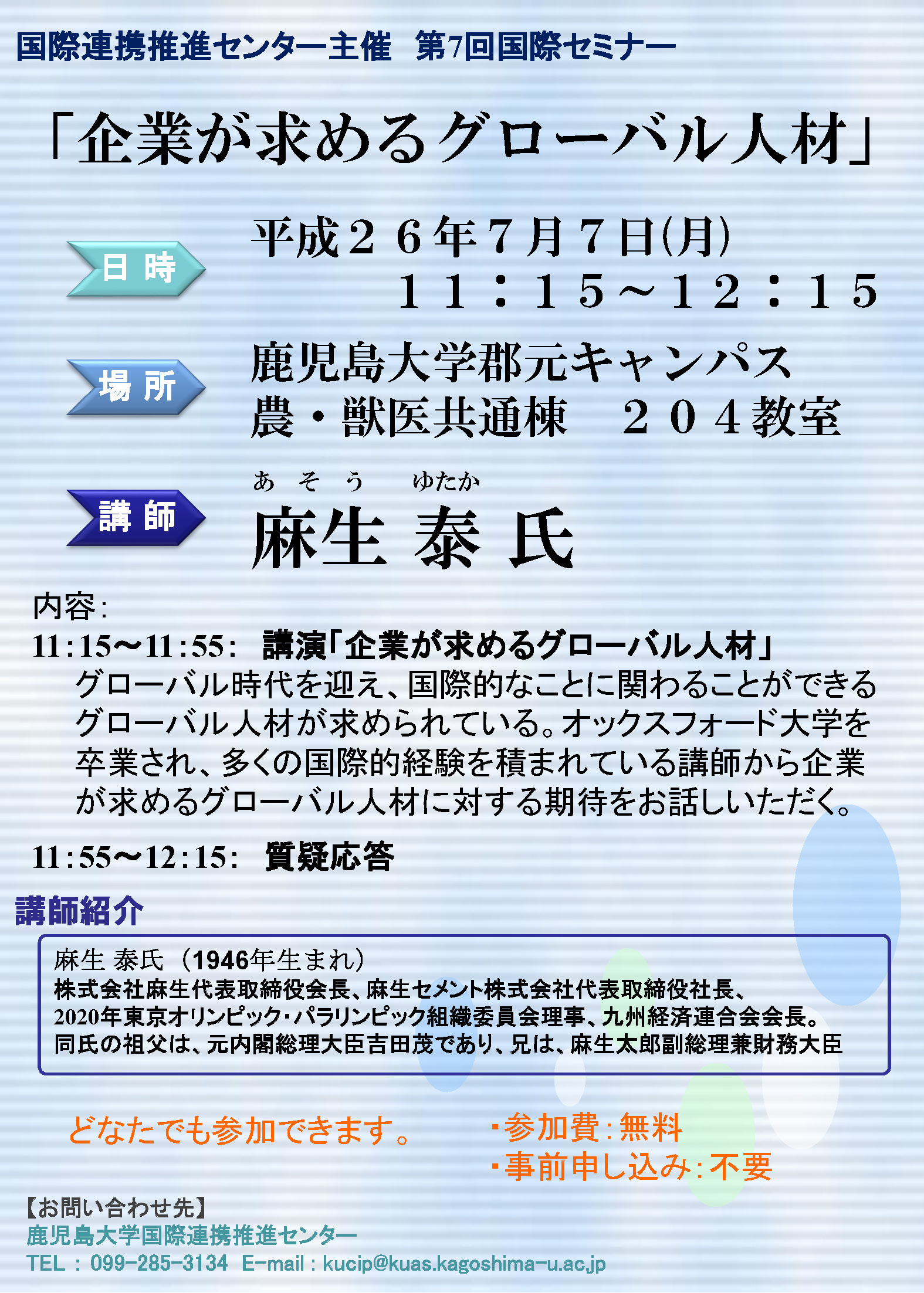 【開催日時】 平成26年7月7日(月)11:15~12:15 <スケジュール> 11:15~11:55 : 講演 「企業が求めるグローバル人材」 グローバル時代を迎え、国際的なことに関わることができるグローバル 人材が求められている。オックスフォード大学を卒業され、多くの国際 的経験を積まれている講師から企業が求めるグローバル人材に対する期 待をお話しいただく。