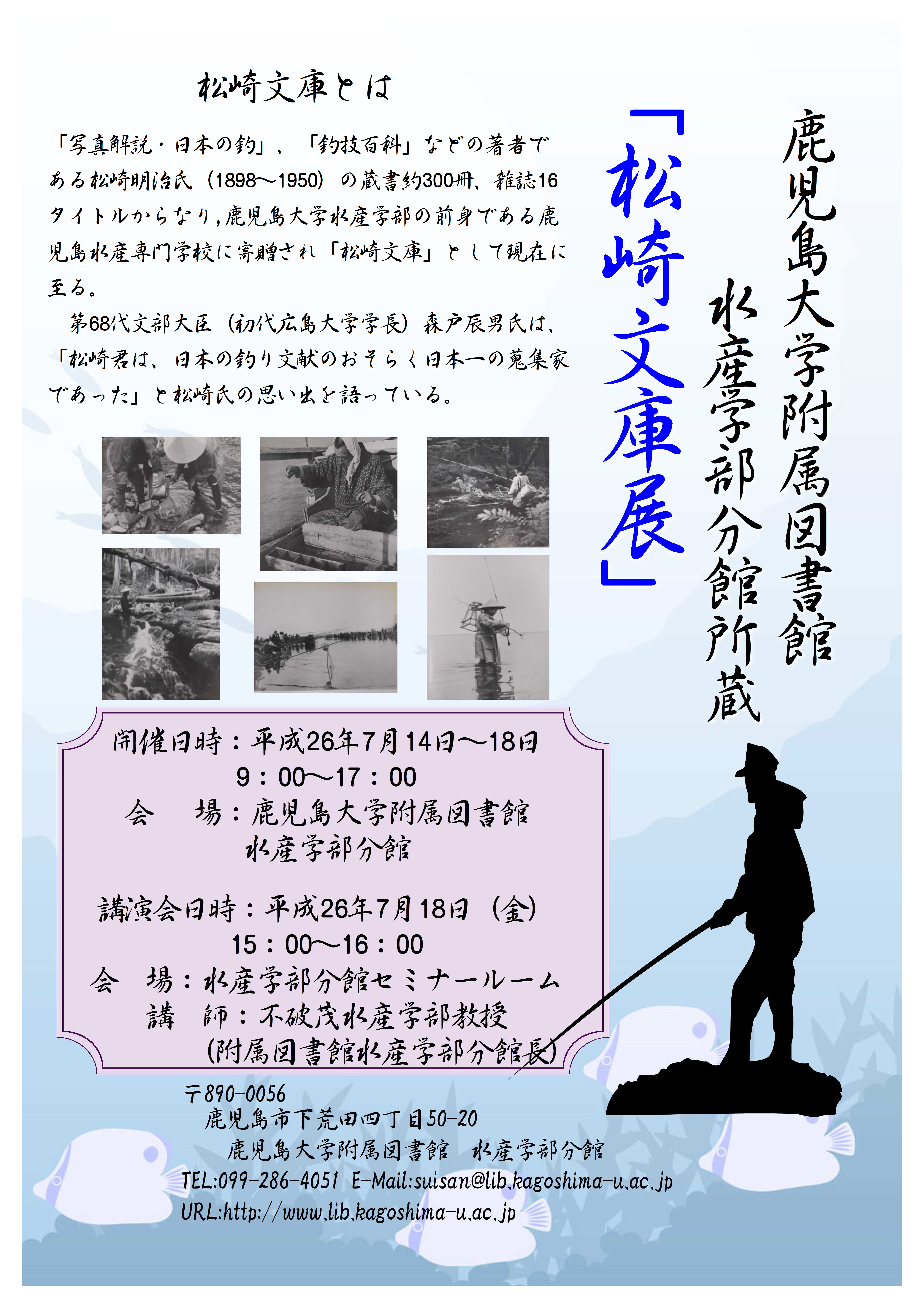 「写真解説・日本の釣」、「釣技百科」などの著者である松崎明治氏(1898~1950)の蔵書約300冊、雑誌16タイトルからなり、鹿児島大学水産学部の前身である鹿児島水産専門学校に寄贈され「松崎文庫」として現在に至っています。