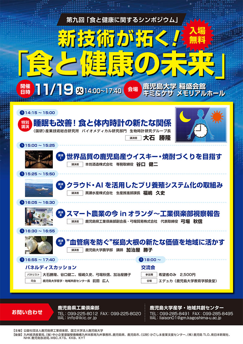 第9回目の本年は「新技術が拓く食と健康の未来」と題して、ノーベル賞でも話題になった体内時計と食の関係に関する特別講演と企業と研究者が取り組む食品生産の新技術、オランダのスマート農業の視察報告を紹介します。参加費無料、一般の方向けシンポジウムですので、お気軽にご参加ください。