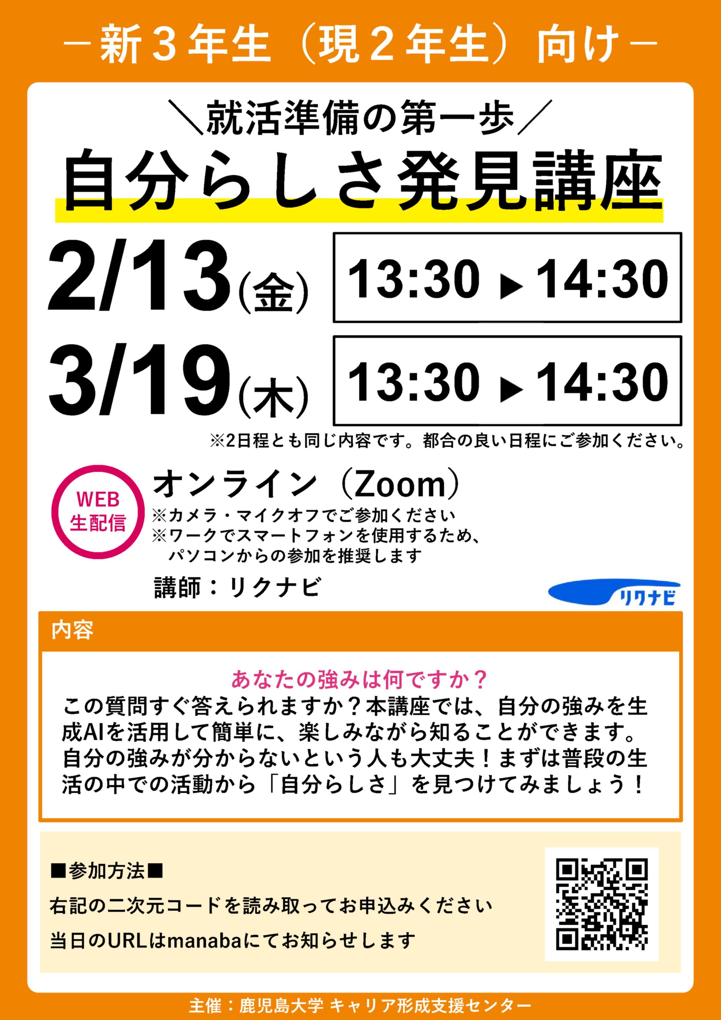 2月13日、3月19日開催 新3年生向け「自分らしさ発見講座」のお知らせ
