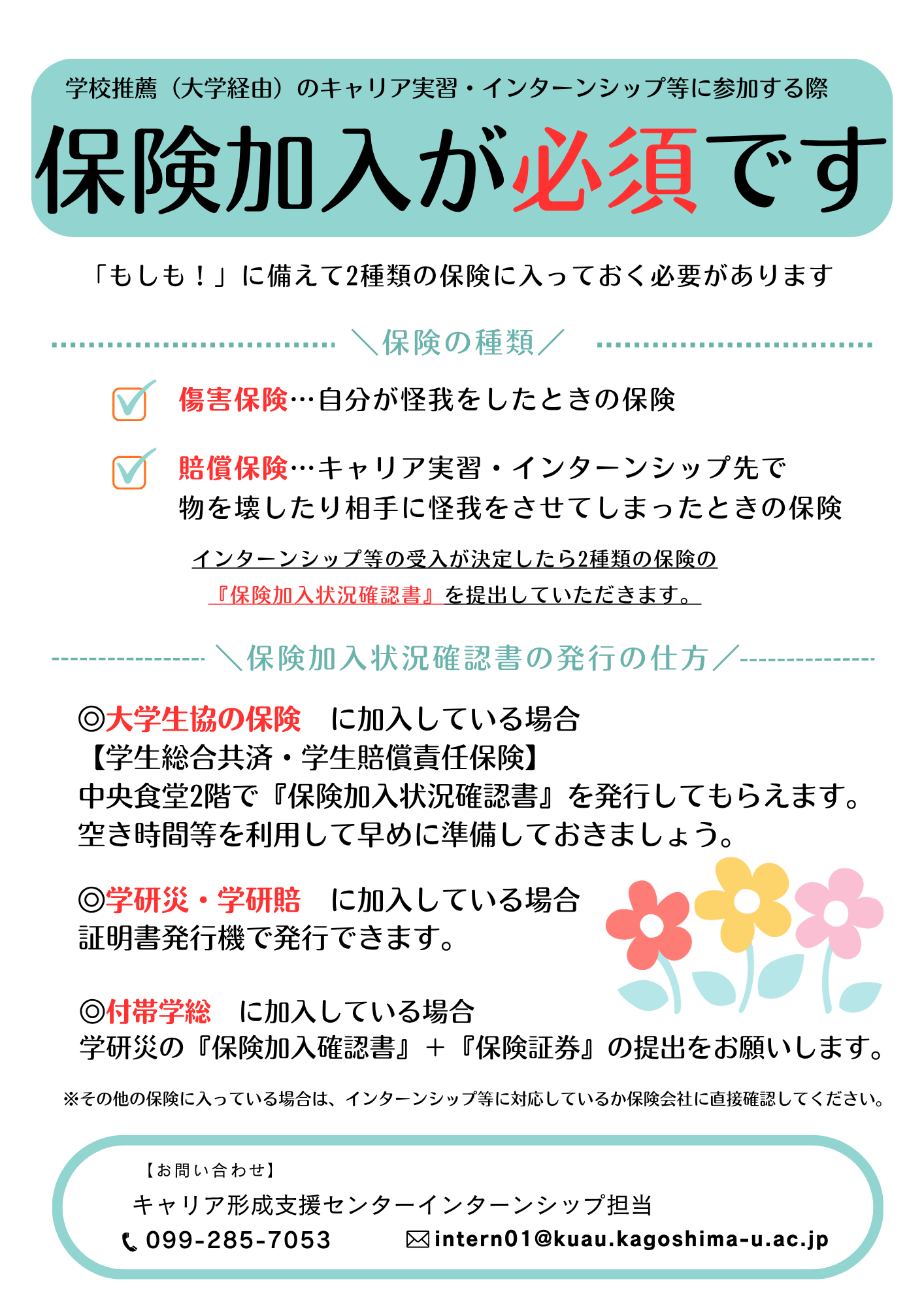 また、学校推薦(大学経由)によるキャリア実習・インターンシップ等に参加する場合は、傷害保険および賠償保険の2種類の保険に加入しておく必要があります。