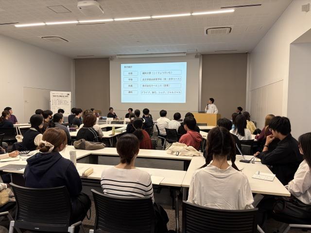 ゲストスピーカーの卒業生により、就職活動やキャリア形成、大学生活の過ごし方に関する励ましと具体的な心構えが語られました。